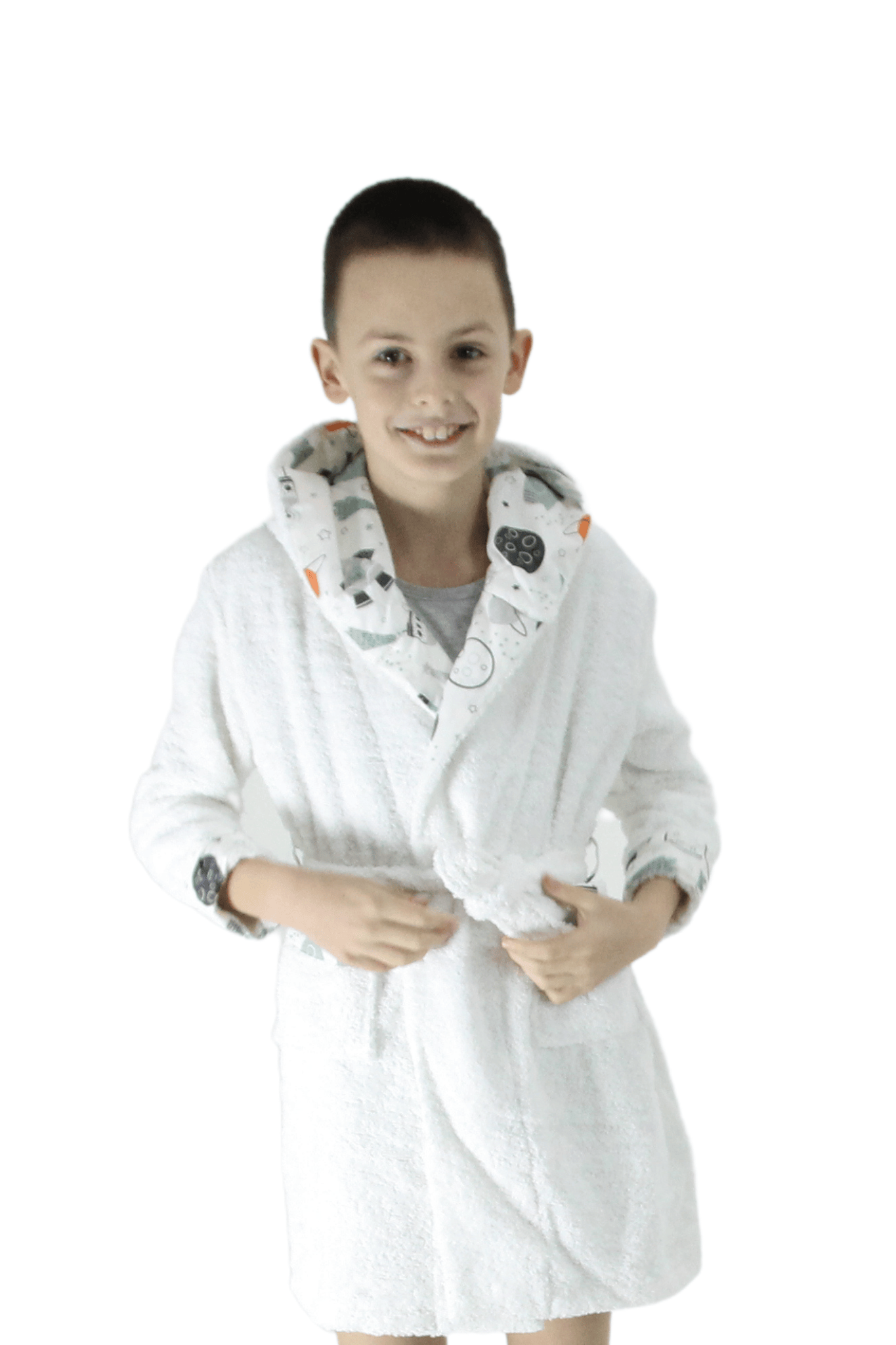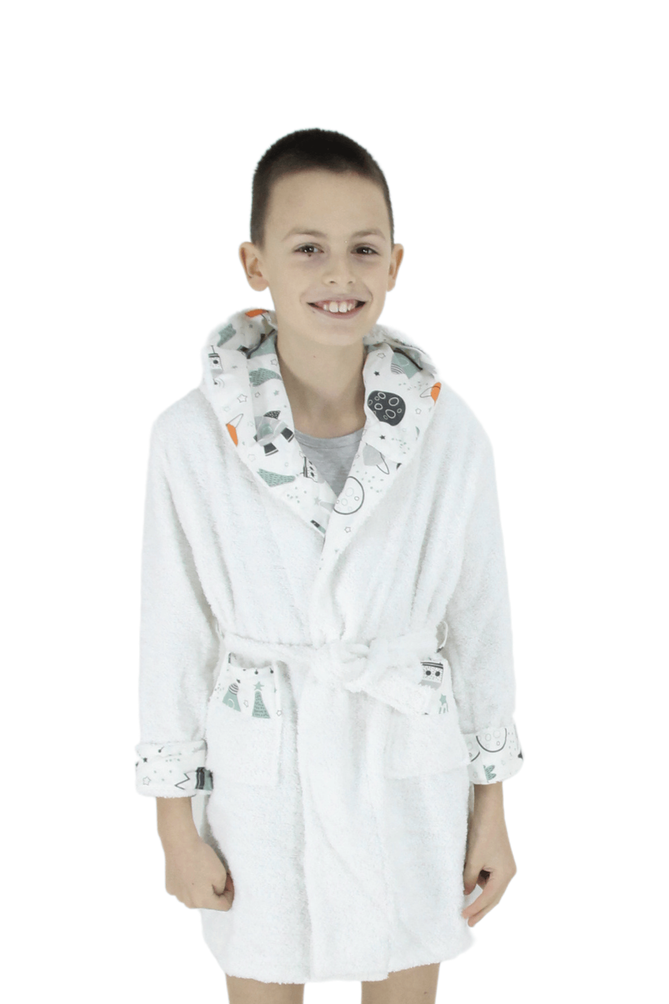 Dizajn: Klasičan kroj bade-mantila sa kaišem i praktičnom kapuljačom. Unutrašnjost kapuljače, reveri i porubi na rukavima su ukrašeni zabavnim geometrijskim/svemirskim motivima u kontrastnoj boji, što unosi veseo i moderan detalj.